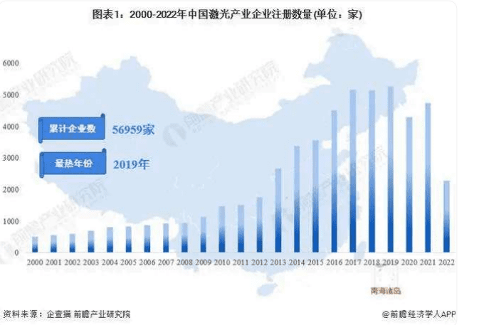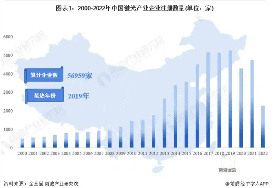 - 根據(jù)中國企業(yè)數(shù)據(jù)庫企查貓,目前中國激光產(chǎn)業(yè)行業(yè)的主要企業(yè)共有56959家,其中以2017-2019年為主要注冊(cè)熱潮,2017-2019年三年新增注冊(cè)企業(yè)超五千家。2021年注冊(cè)企業(yè)數(shù)量為4737家,而2022年則為2284家。